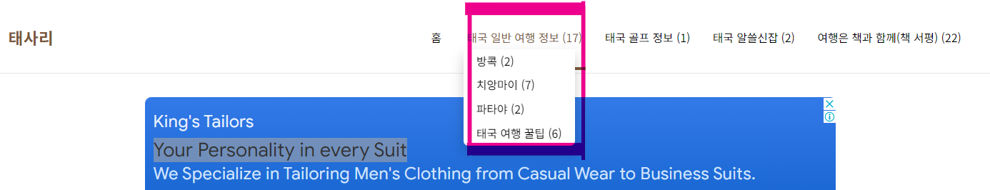 결과물을 보여드리면 기존 상단 메뉴바에 아래 사진과 같이 하위 카테고리를 구분하여 블로그 방문자가 쉽게 이 블로그에 어떤 정보들이 있는지 확인 할 수 있습니다.
