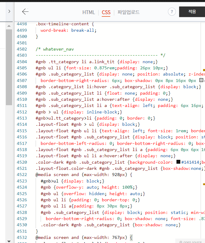 - CSS 가장 마지막 빈줄에 아래 코드 카피 후 붙여 넣기