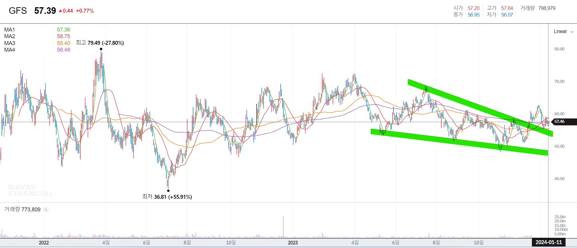 주식 주기 1단계, 22년 6월 이후 40 ~ 70$ 사이의 큰 박스권을 형성하며 횡보중.