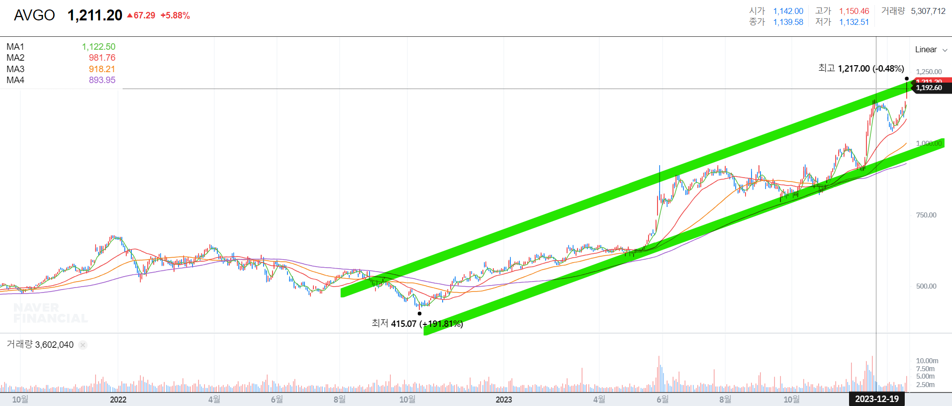 22년 말 대비 100% 이상 주가가 올랐다. 미친듯한 상승을 이어가고 있다. 22년 말에 샀다면 배당 성장주로서의 이점은 물론, 주가 상승의 재미까지 쏠쏠히 챙겼을 것이다. 현재도 MP 보다 주가가 높고, 최근 많은 거래량이 있어 추가 상승을 기대해 볼 수도 있겠지만, 쫄보인 나는 못들어가겠다.