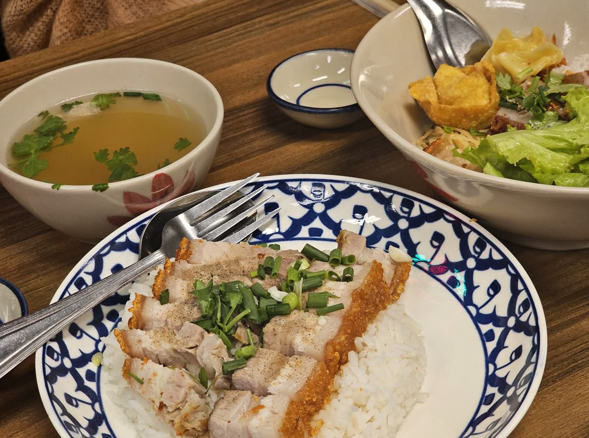 무끄럽을 밥과 같이 주는 카오무끄럽과, 국수(꾸에이띠아오)와 같이 주는 음식을 먹었는데,