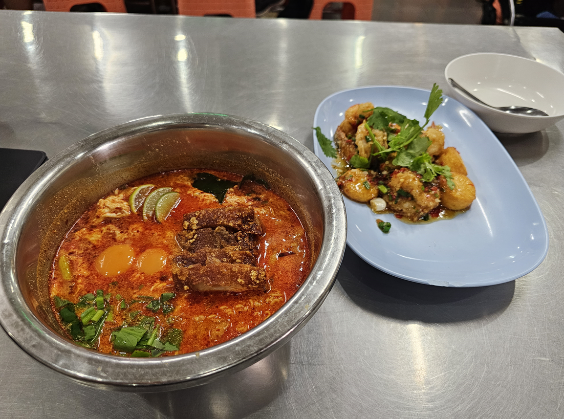 돼지고기 튀김 똠냥 라면을시켰습니다. 해산물이 잔뜩 들어간 똠냥 라면으로 시키고 싶었지만, 그건 3인분 부터 시작하는 듯합니다. 가격이 670바트(약 26,000원).